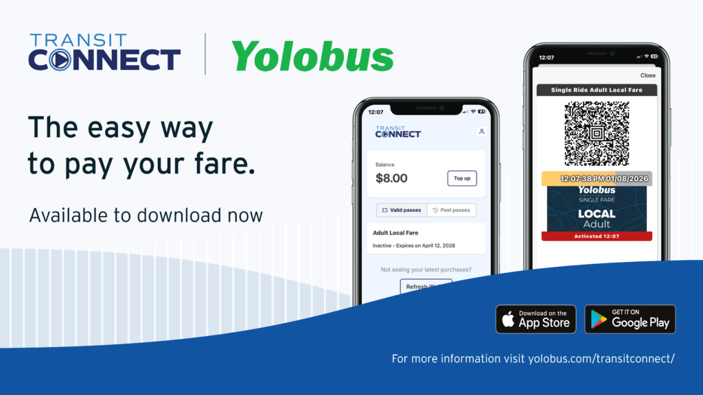 Riders can download Transit Connect and purchase tickets or passes directly from their smartphone (regular and discount fares available, along with monthly passes and SacRT/Yolobus passes). Simply show your activated ticket to a bus operator just like with the ZipPass app, which will be phased out by April 30.